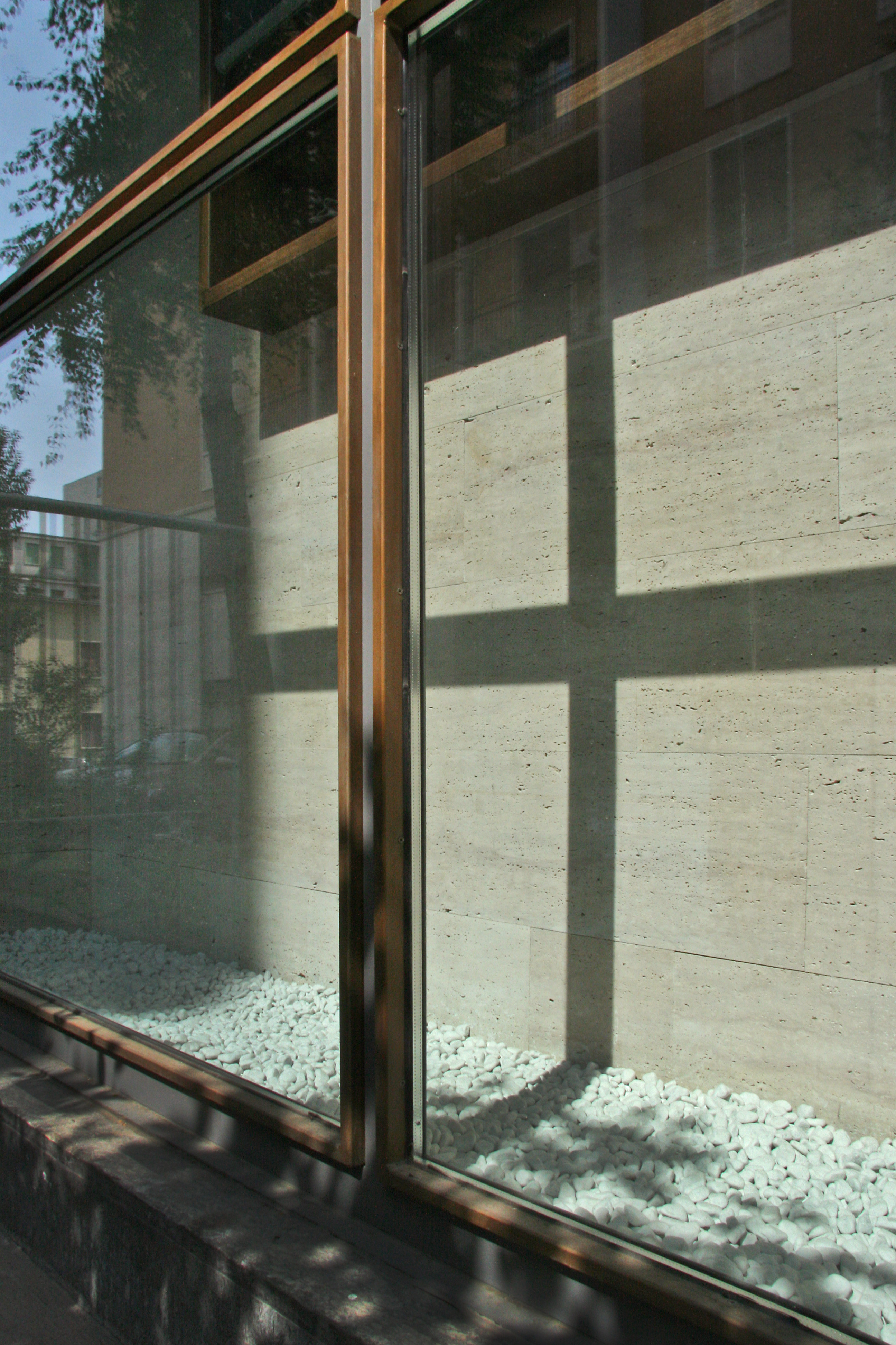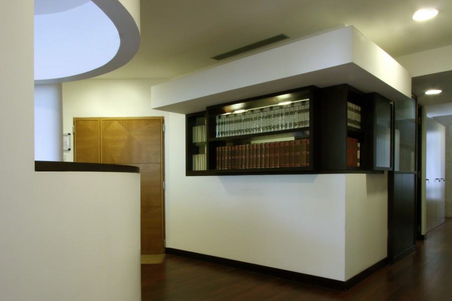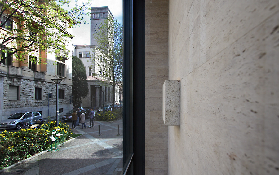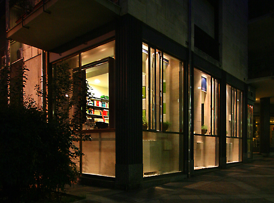 Breve descrizione: Il progetto di trasformazione di un negozio fronte strada in uno studio di avvocati nasce dalla sfida di un giovane avvocato nel rendere pubblico un lavoro che abitualmente viene eseguito “in segreto”, quindi di rendere pubblica un’attività riservata. Cosi è nata l’idea di lasciare la facciata vetrata su strada ma di renderla come una teca che custodisce il “palazzo del diritto”, quel diritto romano che è il sistema legale originario nella maggior parte dell’Europa occidentale. Quindi la teca in ferro e vetro custodisce la scatola di travertino romano, creando una separazione fra spazio pubblico e spazio privato.