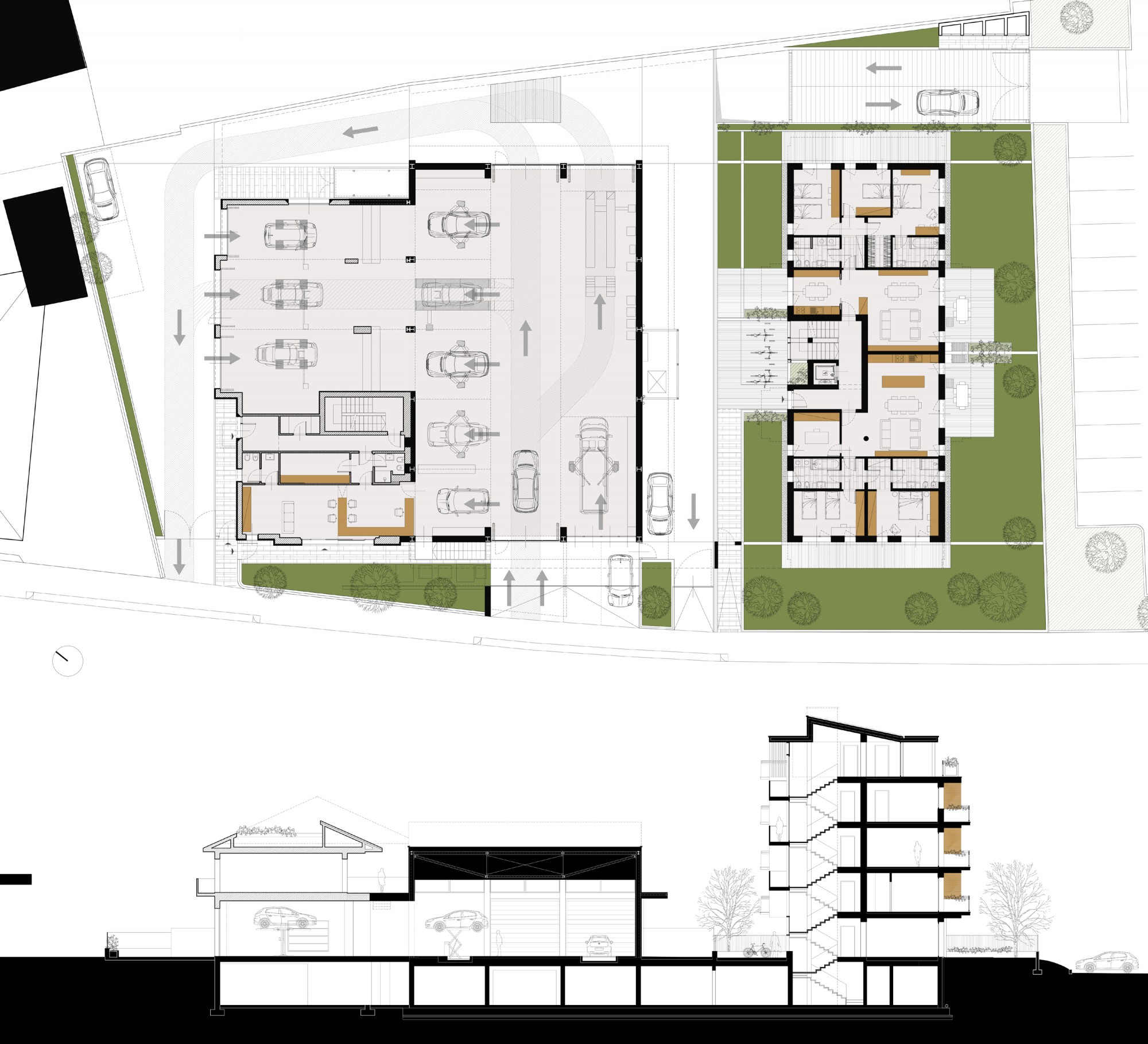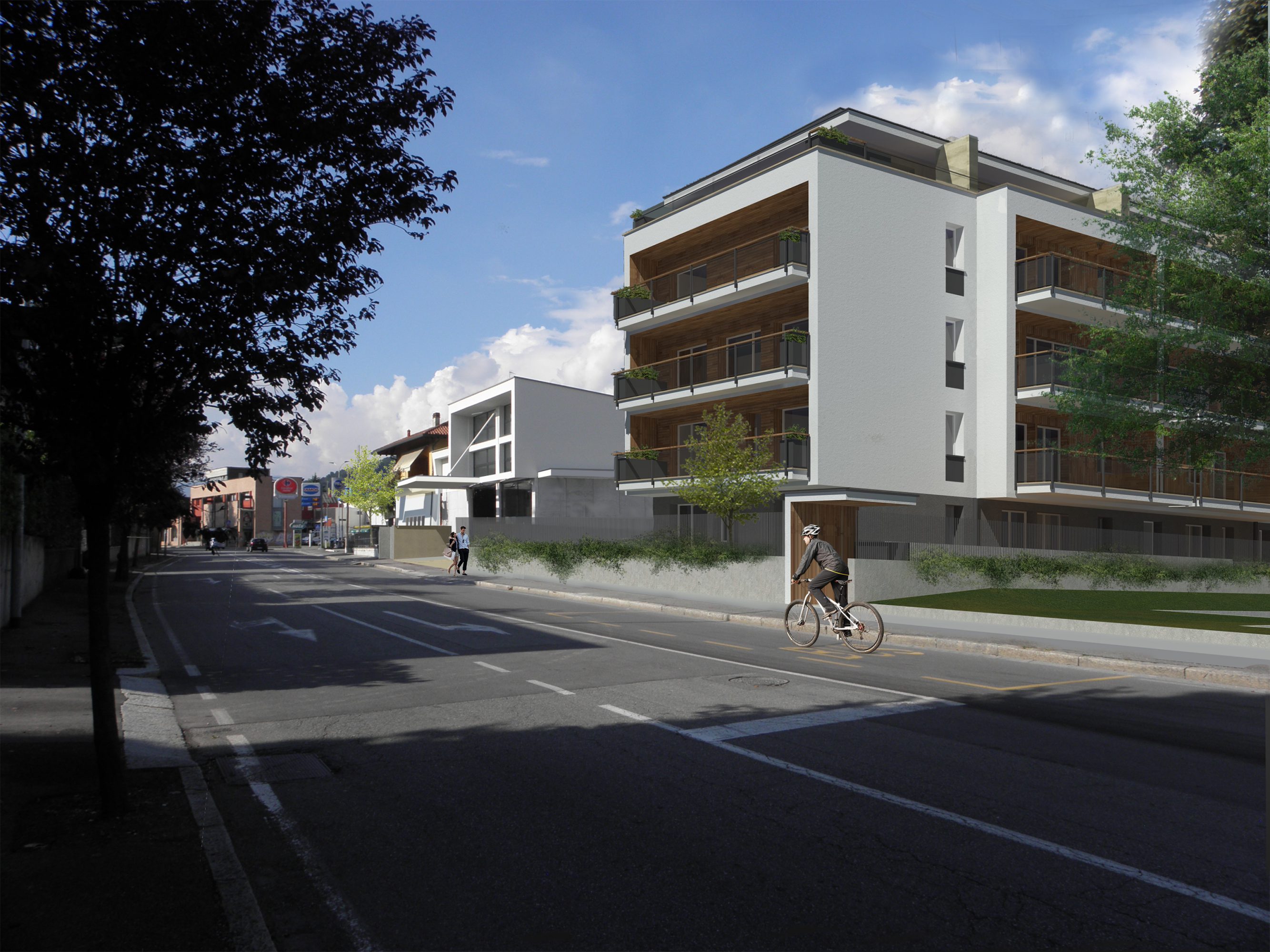 Si tratta ad ogni modo di un unico organismo edilizio, progettato in modo unitario, legato dal piano interrato comune ma composto da tre edifici distinti, uno esistente che viene leggermente modificato ed ampliato, un edificio unitario progettato come ampliamento dell’attività artigianale ed il terzo residenziale più alto che per sua natura tipologica si distingue nel complesso. Tutti gli edifici hanno gli accessi indipendenti su Via Baioni e un accesso comune all’interrato nell’ingresso all’area privata già preesistente nell’attuale parcheggio.